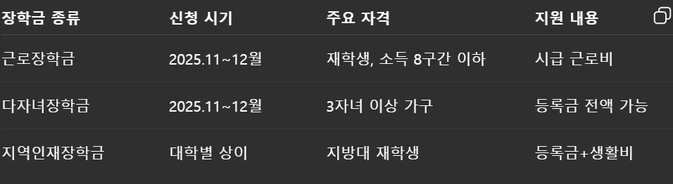 • 신청기간: 2025년 11월 말 ~ 12월 중 (국가장학금 1차 신청 시 함께)