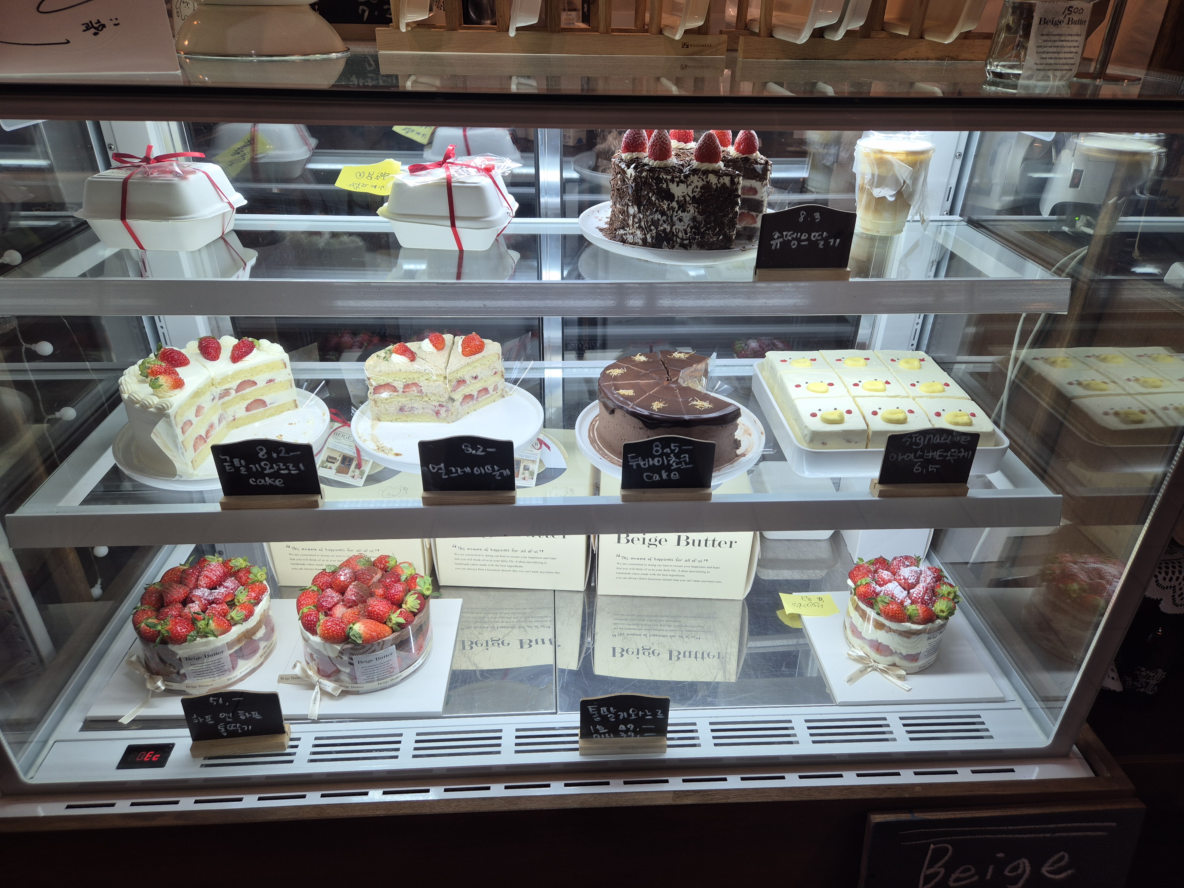 베이지버터는 음료뿐 아니라 딸기가 가득 들어간 홀케이크와 미니케이크도 판매하고 있었어요.